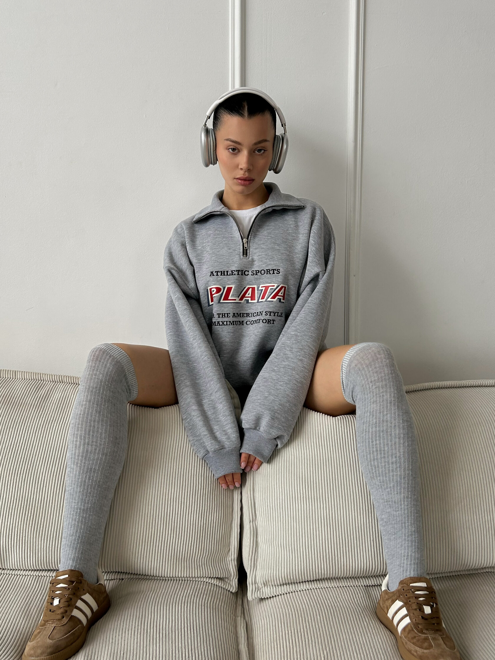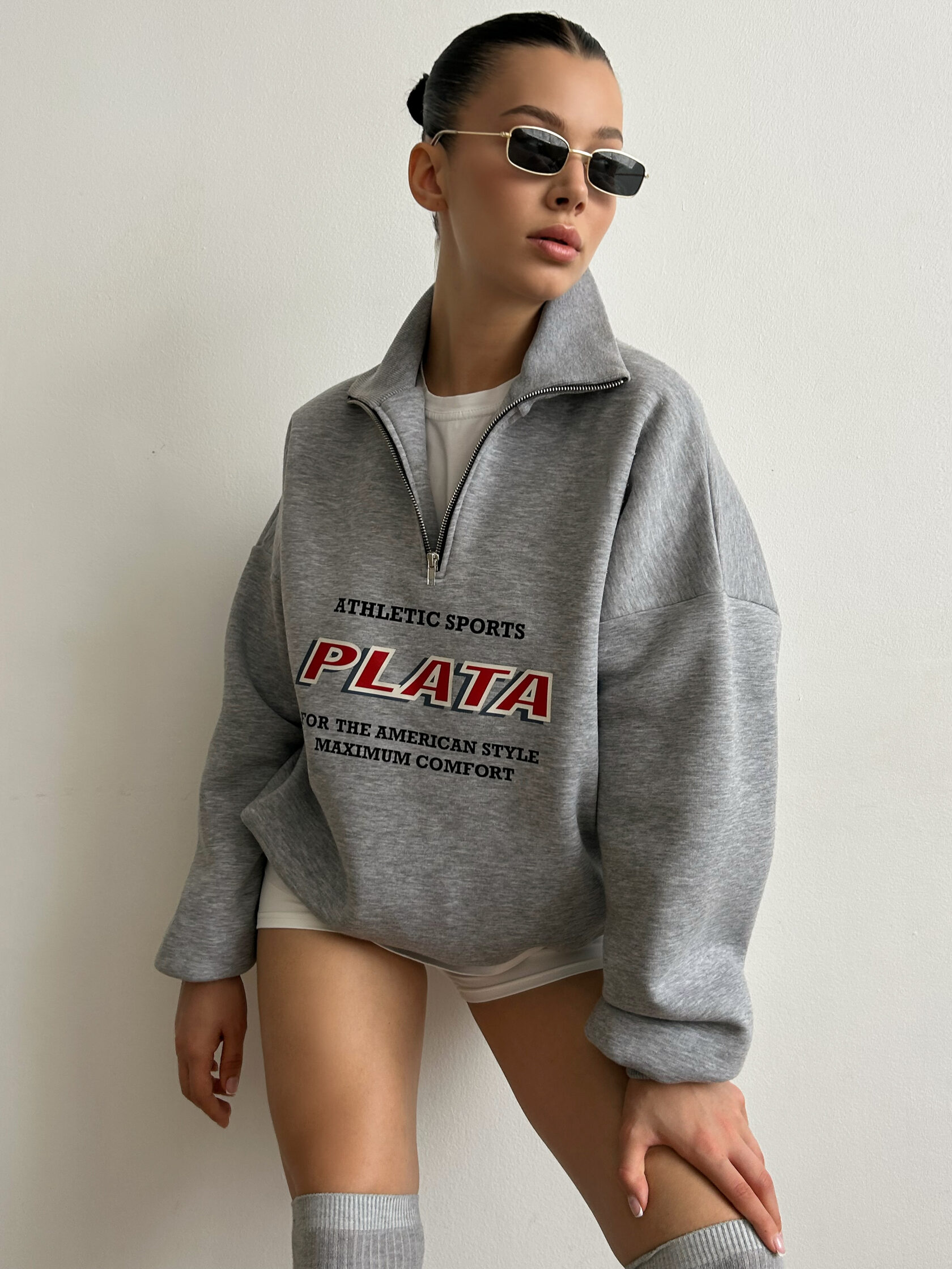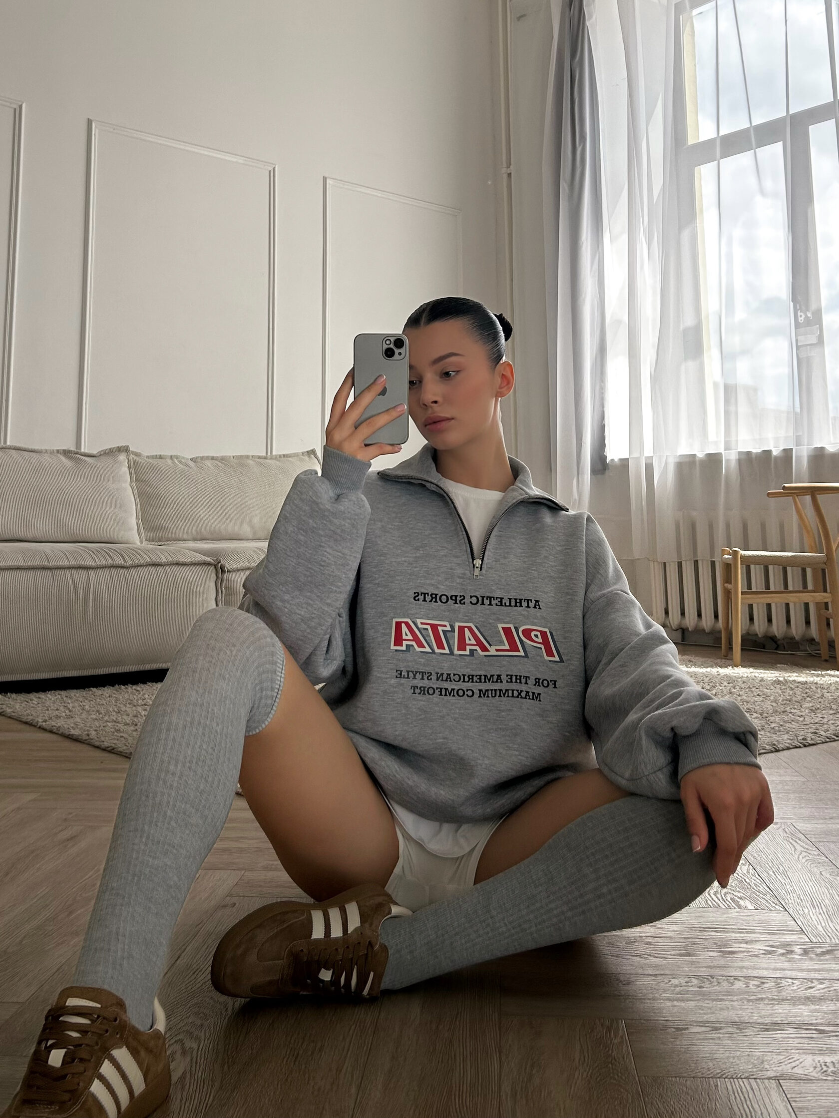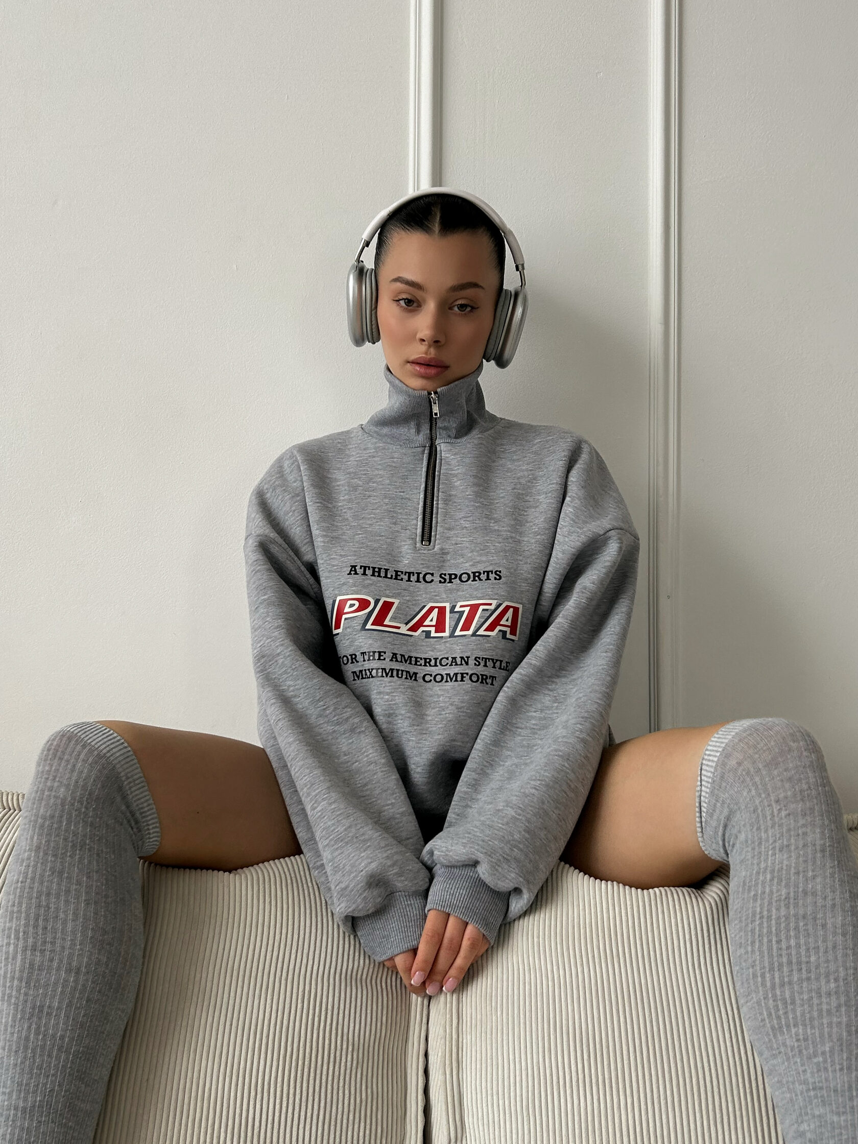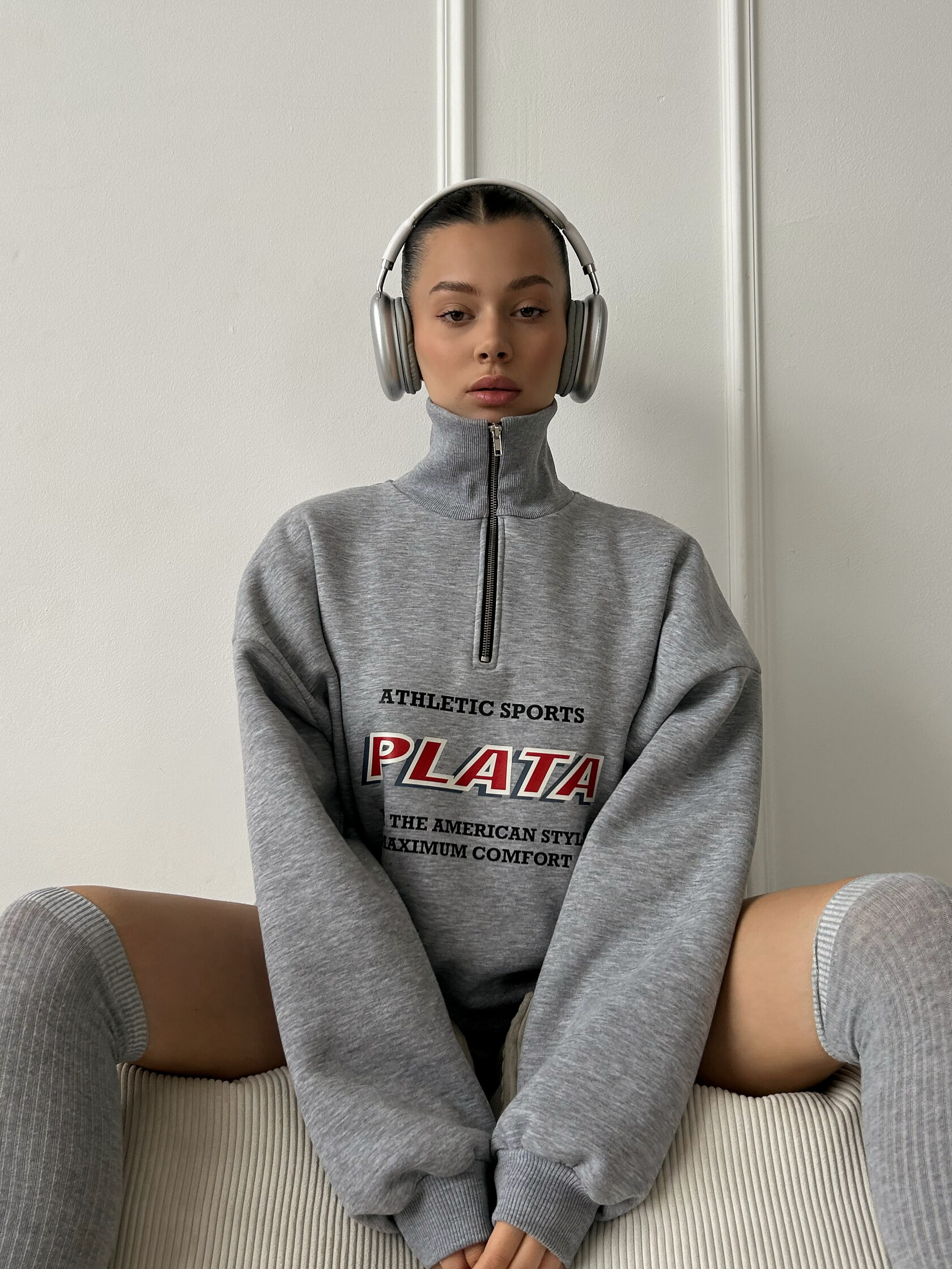Свитшот с воротником стойкой. Выполнен из трикотажного 3х ниточного полотна "футер" с начёсом, качества "пенье компакт". Ворот оснащен застежкой молнией.